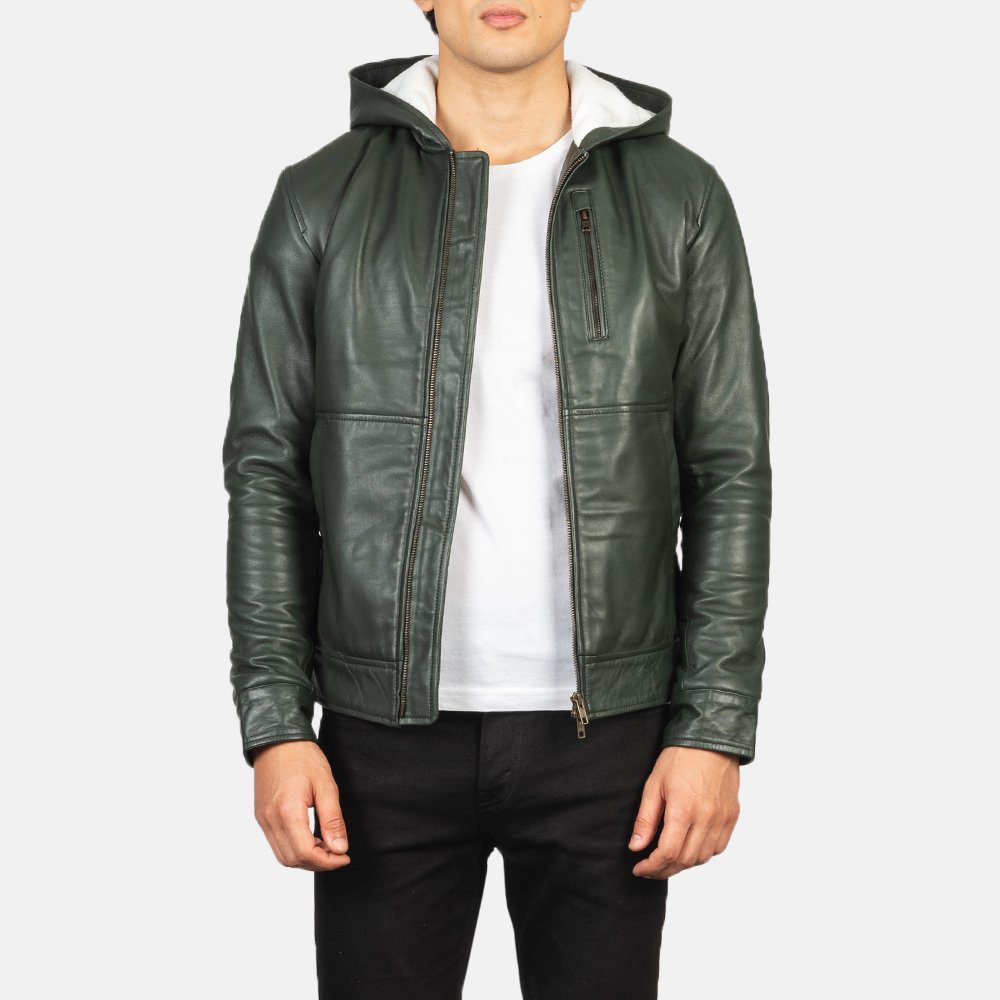 Baston Green Hooded Leather Bomber Jacket by VogueHide