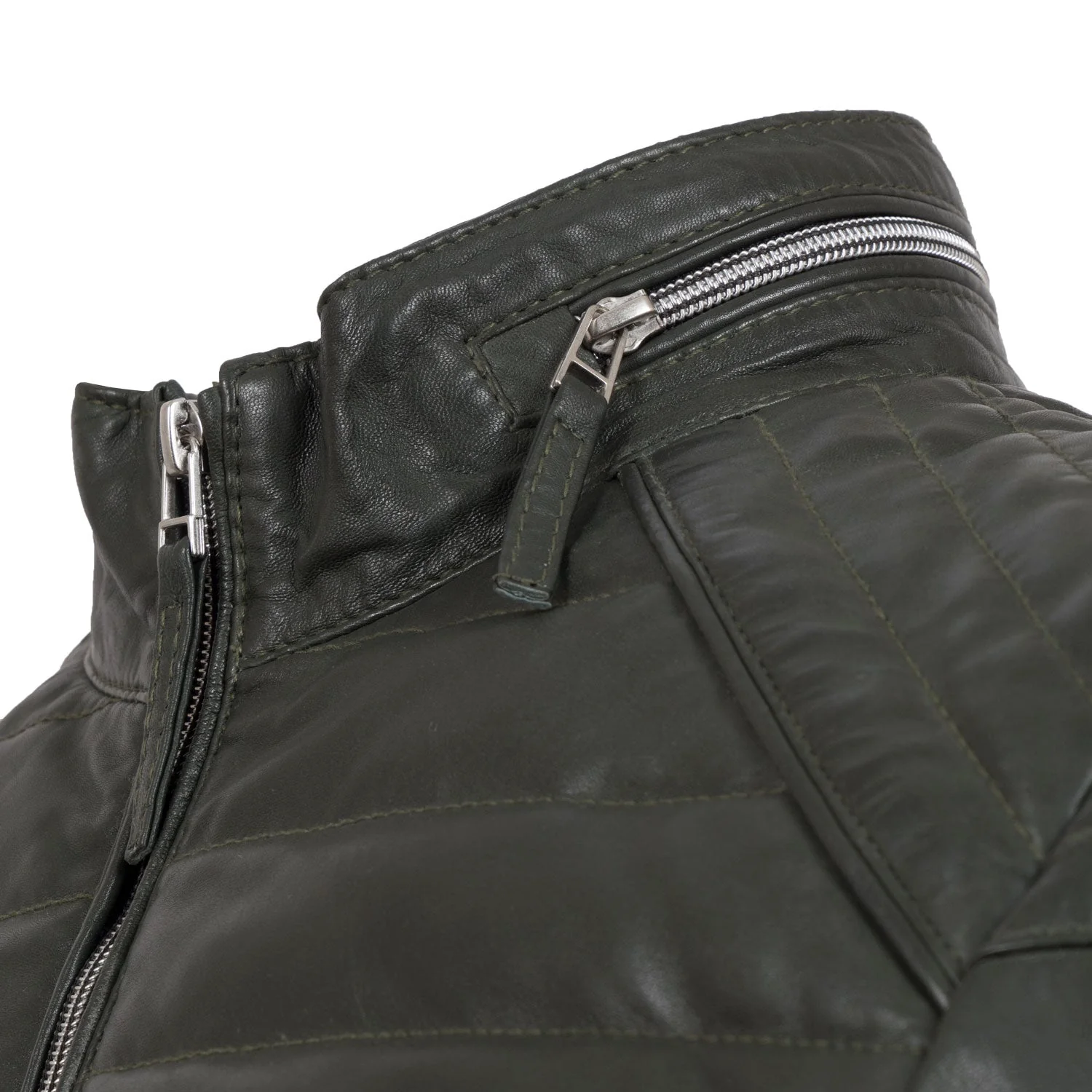 Less bulky than the Palmer leather puffer jacket but with the same quilted funnel style, the Roman grey leather jacket for men is bold and striking. Tastefully accented with zipper styling and offset shoulder pads, this Style Gears leather jacket for men is sure to inspire your wardrobe to reach new heights.